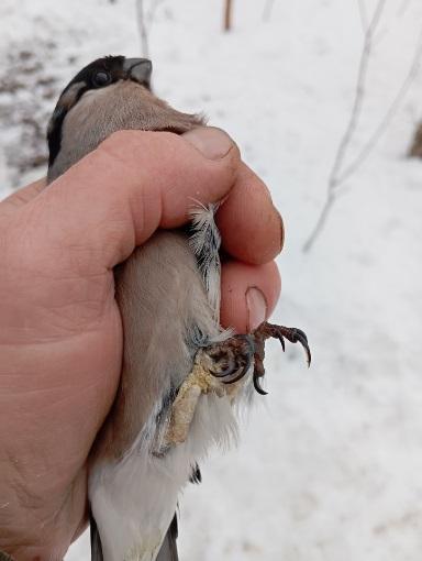 Сегодня у меня два снегиря попались с больными лапками У самки чесотка-клещ Knemidocoptes,а у самца какая-то травма цевки с наростами и корками,но при этом пальцы здоровые.Думал,может,кольцо когда-то было,и пережало цевку,поковырял,нет,кольца не нашёл.