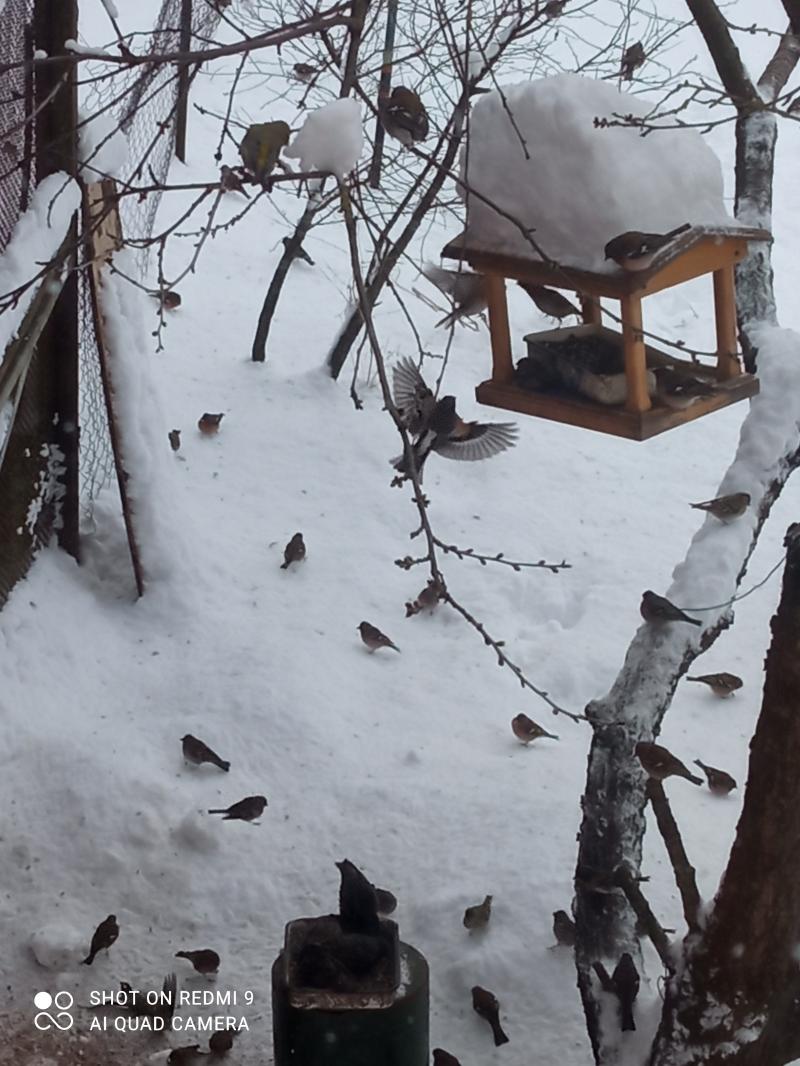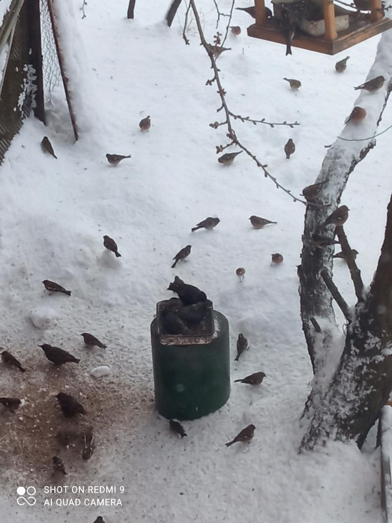 У нас просто ужас. Снега выпало около 20 см. Птицы попали в .... У меня на кормушке около 100-150 птах.80% зяблики, ещё зеленушки, вьюрки, снегири, дрозды, скворцы, дубоносы, зарянки, трясогузки. За день съедают 3хлитровое ведро смеси.